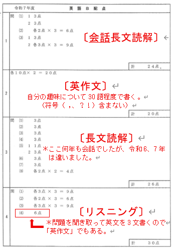 令和6年度からは①会話文読解, ②英作文, ③長文読解,④リスニング へと大きく変更されました。