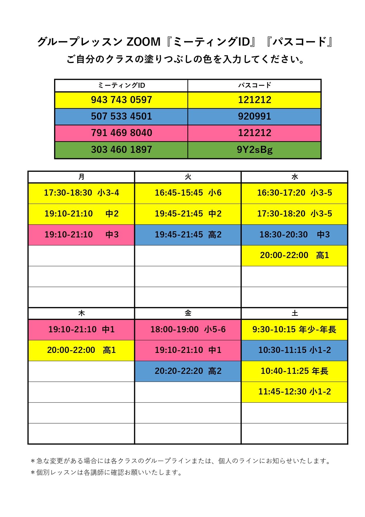2026年4月1日 / 最終更新日時 : 2026年4月1日 yumi オンラインレッスン表 各クラスのオンラインレッスンのZOOMアカウント表です。 塗りつぶしの色と同じミーティングID、パスコードを入力ください。 *ZOOMアプリをアップデートしていないと正しく作動しない場合があります。 2026年度ZOOMアカウント表 FacebookXBlueskyHatenaCopy