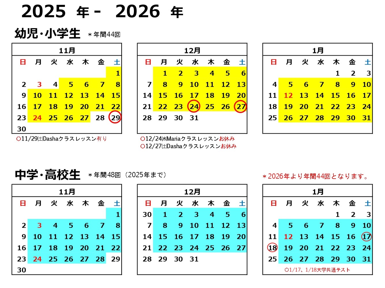 2025年11月25日 / 最終更新日時 : 2025年11月25日 yumi レッスンカレンダー 11月~1月 2025年11月~2026年1月のレッスンカレンダーです。 塗りつぶしのある日がレッスン日です。 *2026年より、中高生のレッスン回数が、年間48回から年間44回に変更になります。 11月-1月 FacebookXBlueskyHatenaCopy