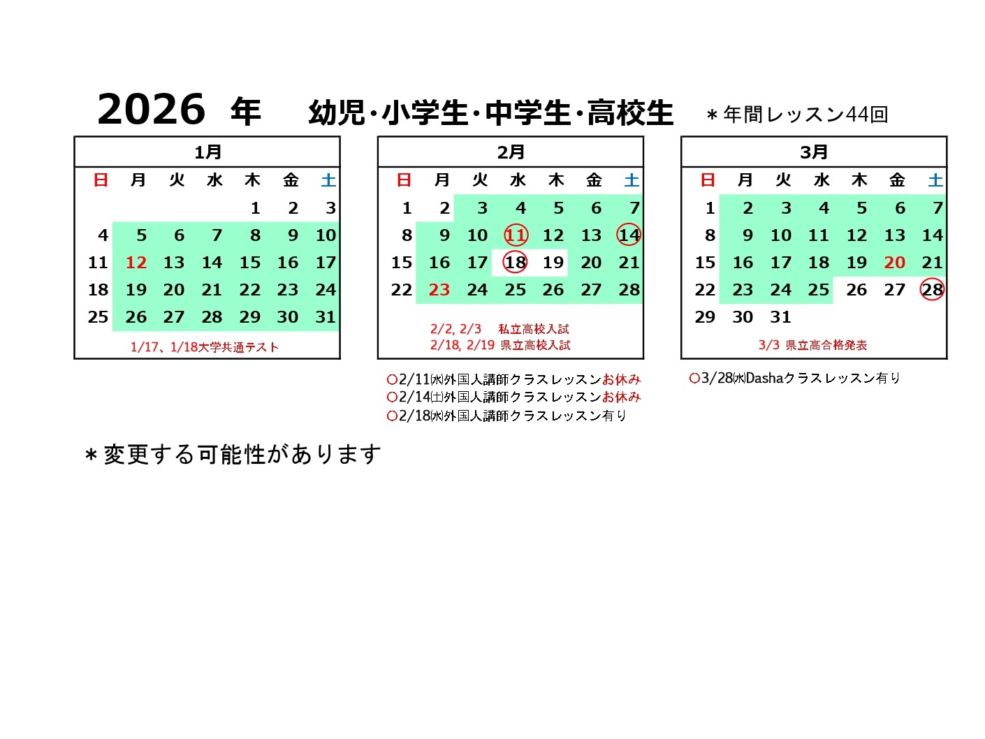 レッスンカレンダー2026年1月~3月