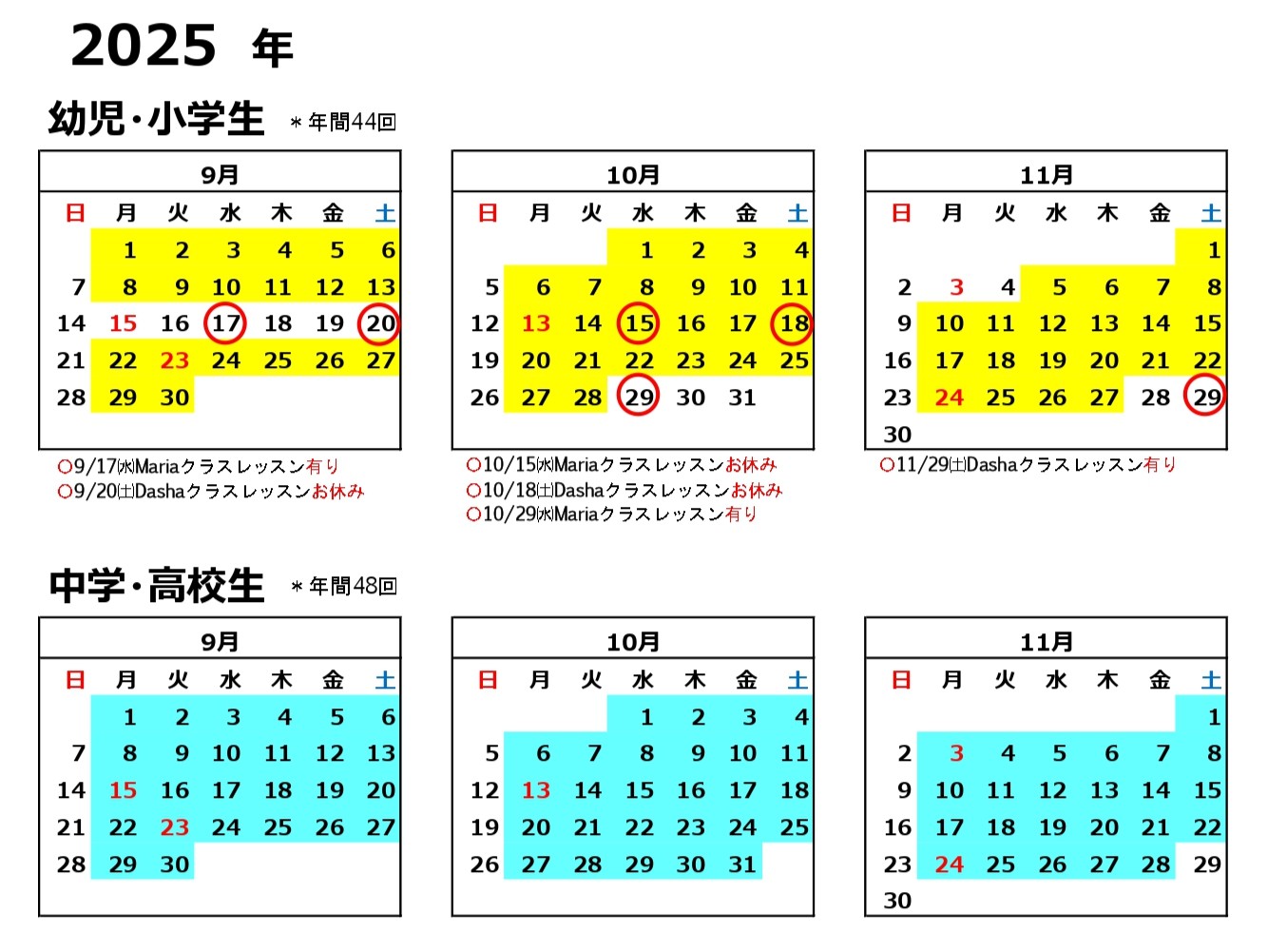 2025年9月3日 / 最終更新日時 : 2025年9月25日 yumi レッスンカレンダー9月~11月 9月~11月のレッスンカレンダーです。 塗りつぶしのある日がレッスン日です。 9-11 FacebookXBlueskyHatenaCopy